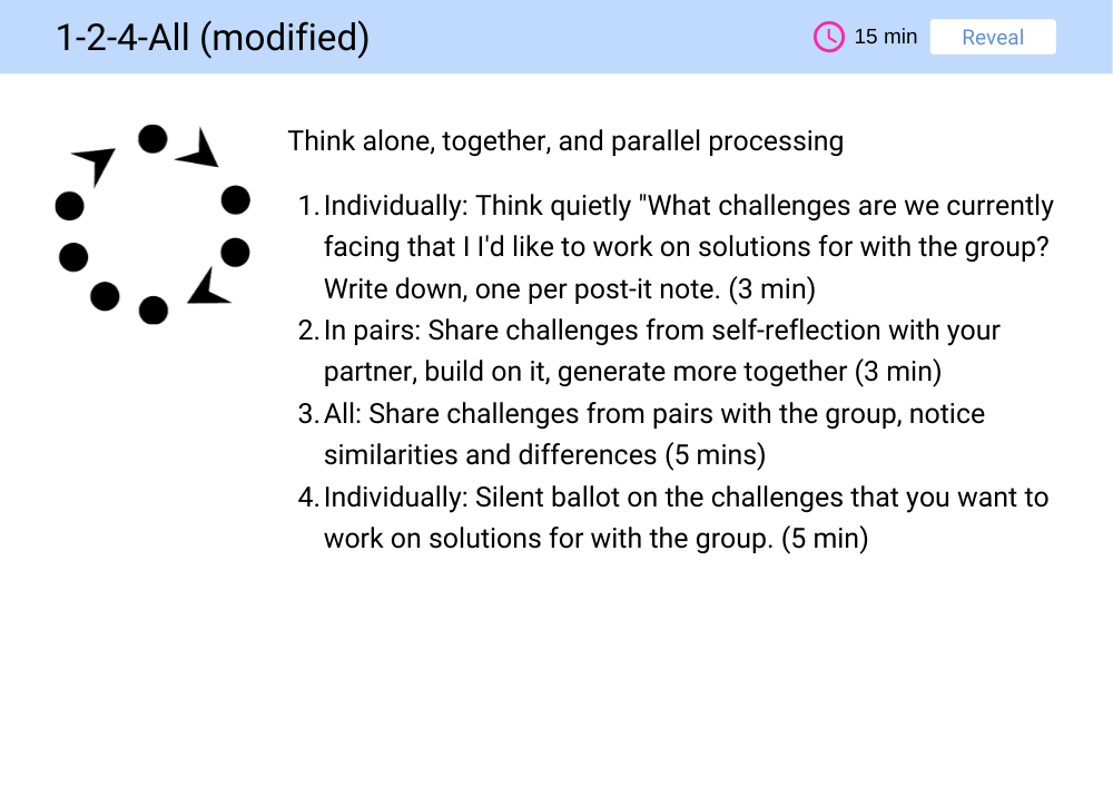 A big thanks to Tim Schneider for running a Liberating Structures workshop for seven teammates and me. In one hour we: